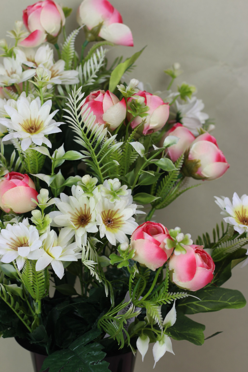 Ce pot de fleurs artificielles est composée de renoncules et des fleurs sauvages. Cette composition est conçue spécialement pour le cimetière. Nos fleurs artificielles pour cimetière ne demandent aucun entretien et résistent aux différentes intempéries. C'est la solution idéale pour garder une tombe fleurie toute l'année.
