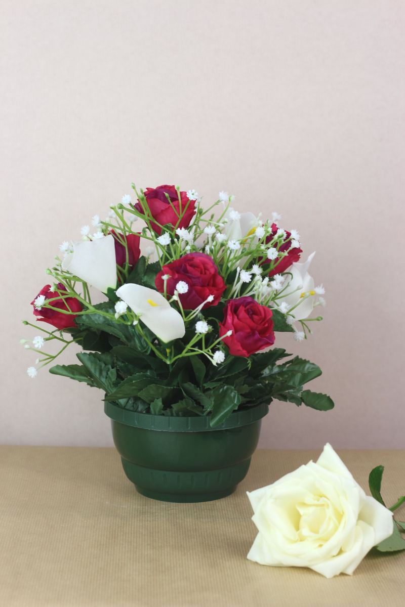 Ce pot de fleurs artificielles est composée de roses arum et gypso. Cette composition est conçue spécialement pour le cimetière. Nos fleurs artificielles pour cimetière ne demandent aucun entretien et résistent aux différentes intempéries. C'est la solution idéale pour garder une tombe fleurie toute l'année.