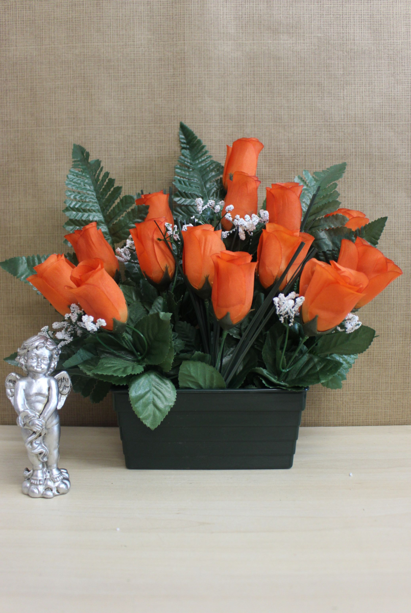 Ce pot de fleurs artificielles est composé de roses et de gypsophile. Cette composition est conçue spécialement pour le cimetière. Nos fleurs artificielles pour cimetière ne demandent aucun entretien et résistent aux différentes intempéries. C'est la solution idéale pour garder une tombe fleurie toute l'année.