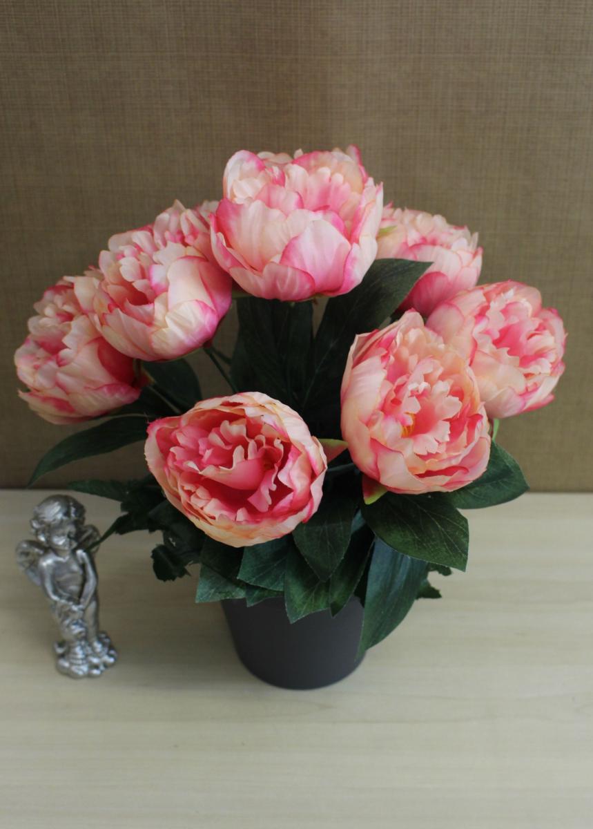 Ce pot de fleurs artificielles est composée de pivoines. Cette composition est conçue spécialement pour le cimetière. Nos fleurs artificielles pour cimetière ne demandent aucun entretien et résistent aux différentes intempéries. C'est la solution idéale pour garder une tombe fleurie toute l'année.