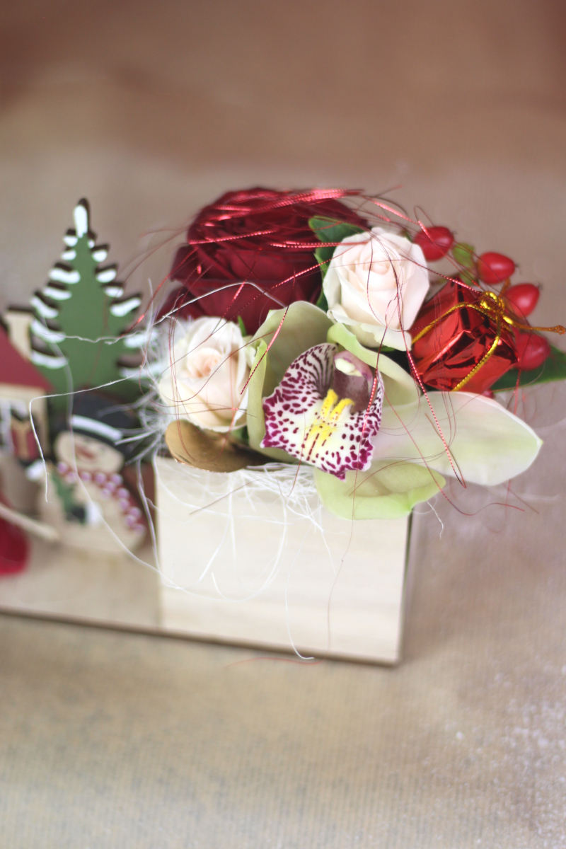 Composition de roses pour Noël. C'est le cadeau idéal à offrir aux hôtes qui vous reçoivent pour le réveillon de Noël.