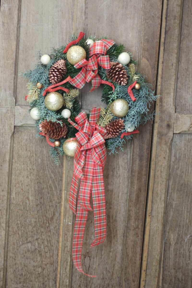 Cette couronne de Noël a été confectionnée avec des boules, des pommes de pin et du ruban.
