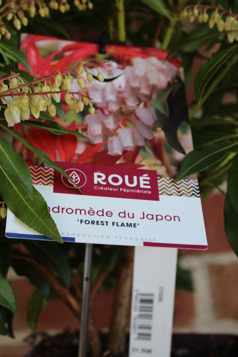 L'Andromède du Japon "Forest Flame" est un arbuste avec une hauteur comprise entre 1.50 m et 1.60m. Très intéressant par son port très compact, dense et touffu ainsi que son feuillage. Celui-ci persistant et de couleur verte et de couleur rouge feu au printemps. La floraison est en forme de pannicules dressées puis de grappes en clochettes est de couleur blanche.